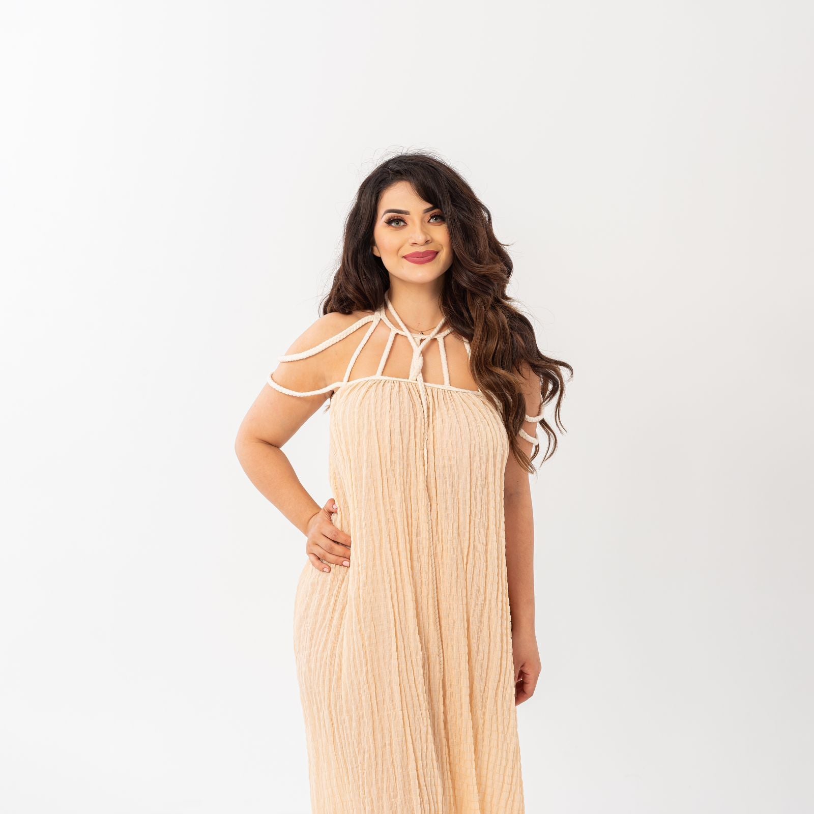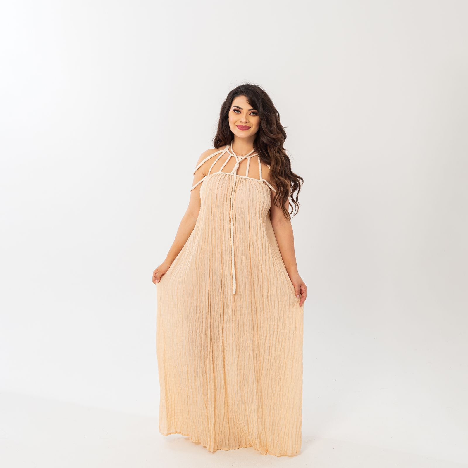 Vestido largo con amarres en su cuello y hombros.